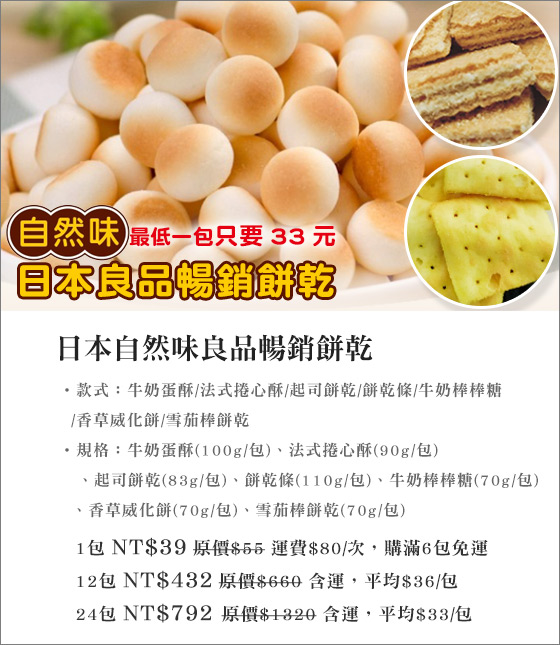 | 日本自然味良品暢銷餅乾-大人小孩都愛吃的日本餅乾,多樣化的選擇,實在的價格,買再多包也划算,午茶、點心、聚會、野餐最佳良伴!平均每包最低只要33元起即可購得日本自然味良品暢銷餅乾1包/12包/24包, 售價:33