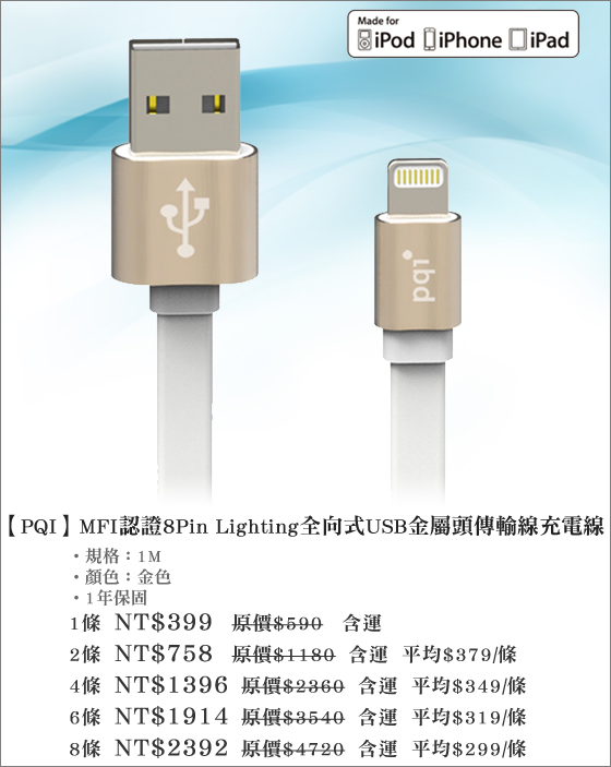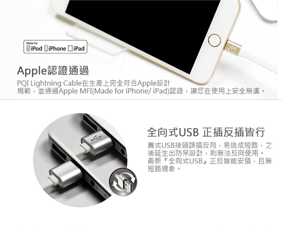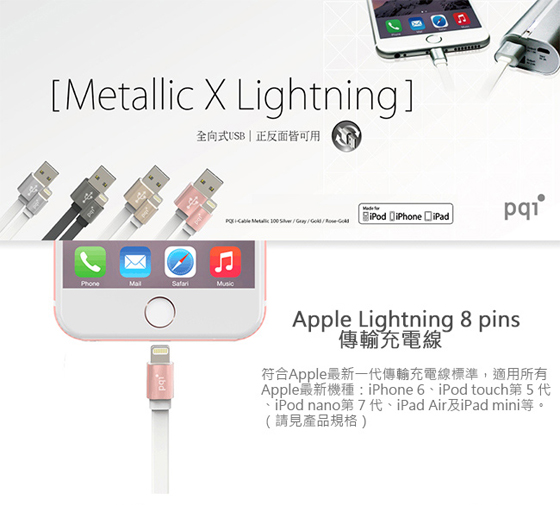 | PQI-MFI認證8Pin Lighting全向式USB金屬頭傳輸線/充電線(1M)-適用最新機種!全向式USB,正反面皆可使用,扁線設計易整理、不糾結,金屬質感,讓蘋果迷一拿上癮!平均每條最低只要2 售價:299
