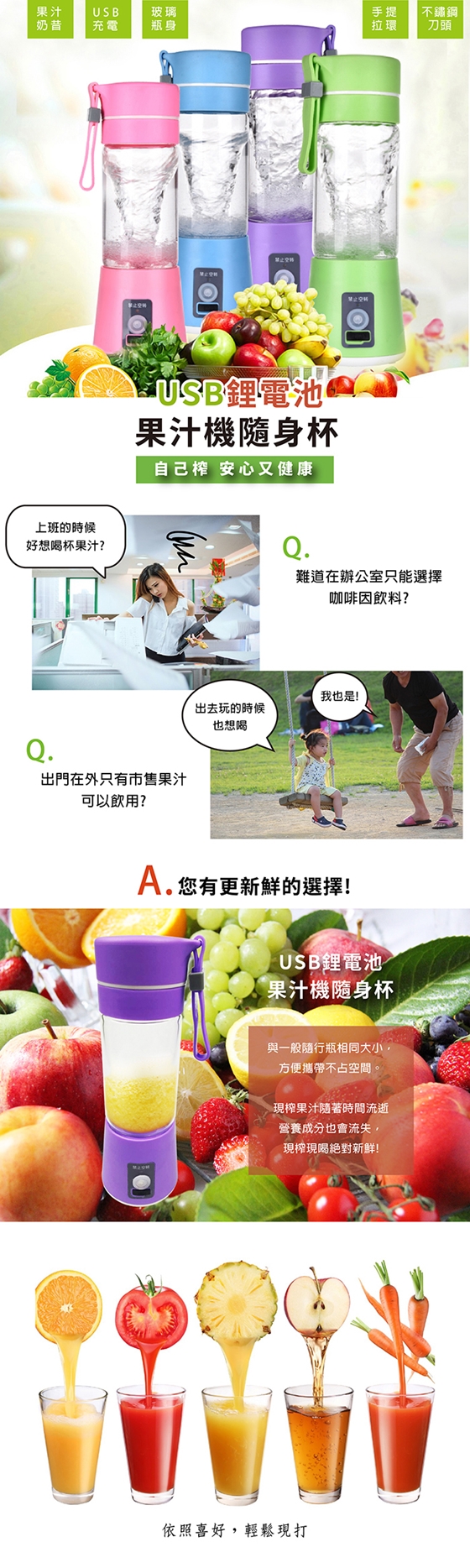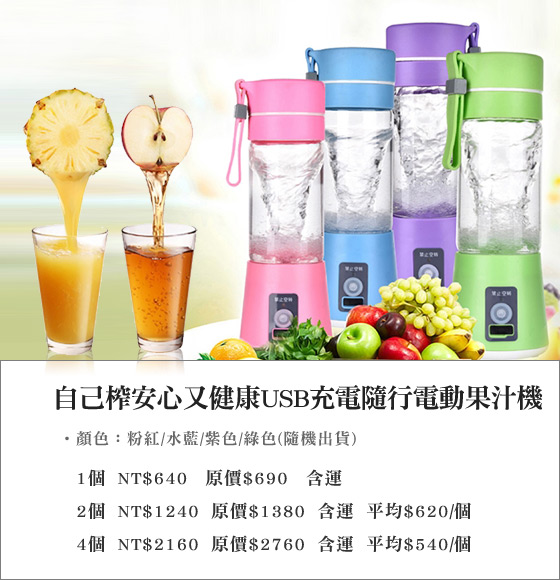 整理了GOOGLE上關於自己榨安心又健康USB充電隨行電動果汁機搜尋前幾名排序的資料來輔助!當今網購市場很競爭,各大購物網為求好業績無所不用其極,殺價毫不手軟。因為我自己也想要了解自己榨安心又健康USB充電隨行電動果汁機,所以到處尋找資訊做功課.google找一下有些人再熱烈討論自己榨安心又健康USB充電隨行電動果汁機.網路購物EC是擋不住的趨勢,可以方便比價只要用功通常都能買到相對便宜的商品! |  | 自己榨安心又健康USB充電隨行電動果汁機-現榨現喝直接順手帶著走,省去清洗果汁機的麻煩,USB充電方便攜帶不占空間 ,運動、野餐隨時享健康平均每個最低只要540元起(含運)即可購得自己榨安心又健康US 售價:540
