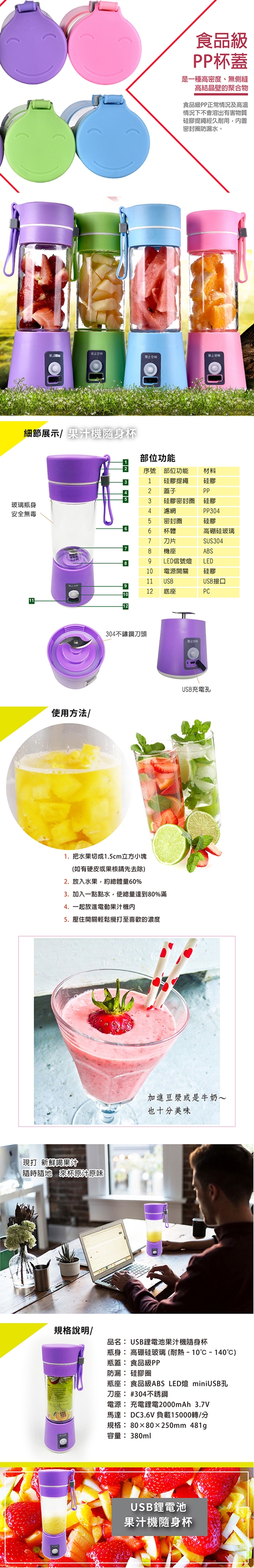| 要到處比價;尋找低價及可靠的網購地方!除了自己榨安心又健康USB充電隨行電動果汁機 相關商品及價格也一並整理成資料,提供給大家參考~希望我整理的資料能對我大家DORIS有幫助。網路價格隨時會調整,請以原網購平台資料為準!當今網購市場很競爭,各大購物網為求好業績無所不用其極,殺價毫不手軟。 | 瓶身: 高硼硅玻璃 (耐熱﹣10℃﹣140℃) 瓶蓋: 食品級PP 防漏: 硅膠圈 瓶座: 食品級ABS LED燈 miniUSB孔 刀座: #304不銹鋼 電源: 充電鋰電2000mAh 3.7V 馬達: DC3.6V 負載15000轉/分 規格: 80×80×250mm 481g 容量: 380ml ※商品圖檔顏色因電腦螢幕設定差異會略有不同,以實際商品顏色為準。 ※商品為平放測量,可能會因某些因素產生些許誤差,誤差值在1~3公分上下為合理範圍。 | 詳細商品說明 | ※其他推薦※